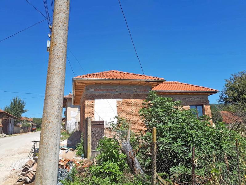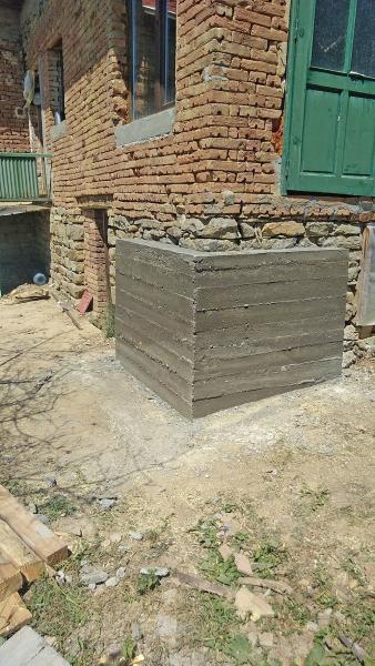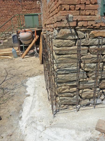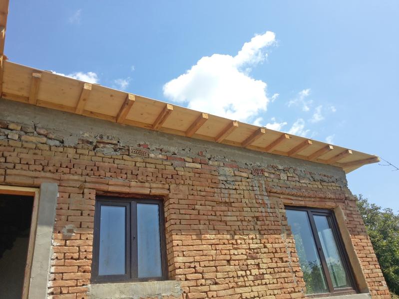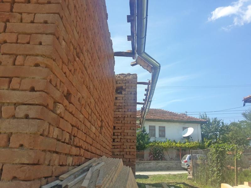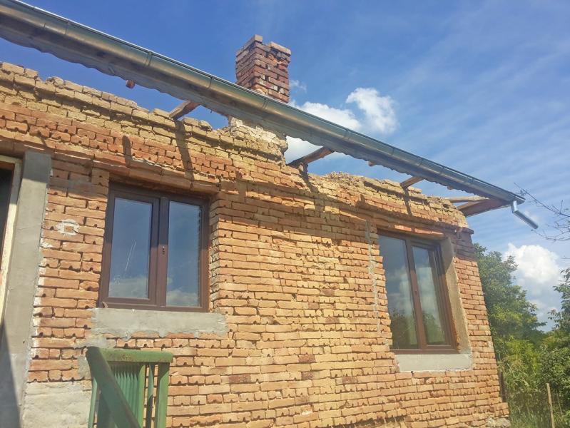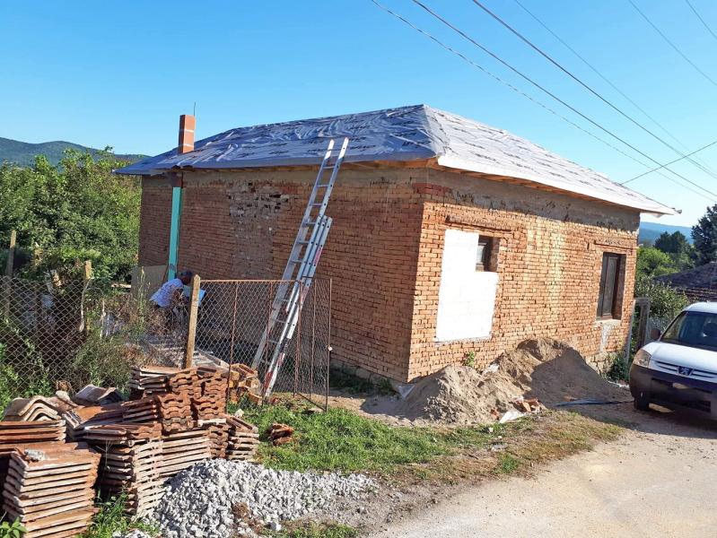 A making of a new roof of a house near the town of Zlataritsa. A wall damaged after an earthquake had to be rebuild and straightened. A corner of the house had to be supported after it had settled and the gaps between the stones were big.
