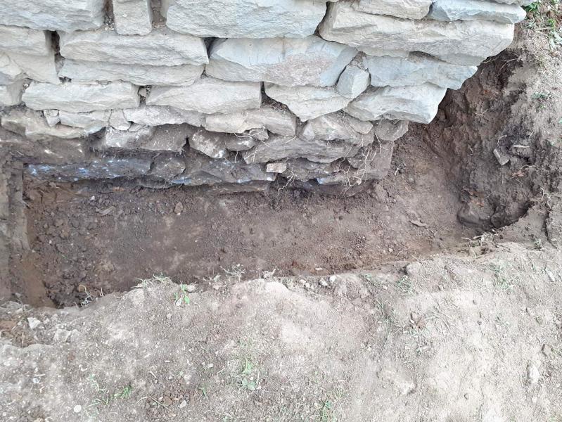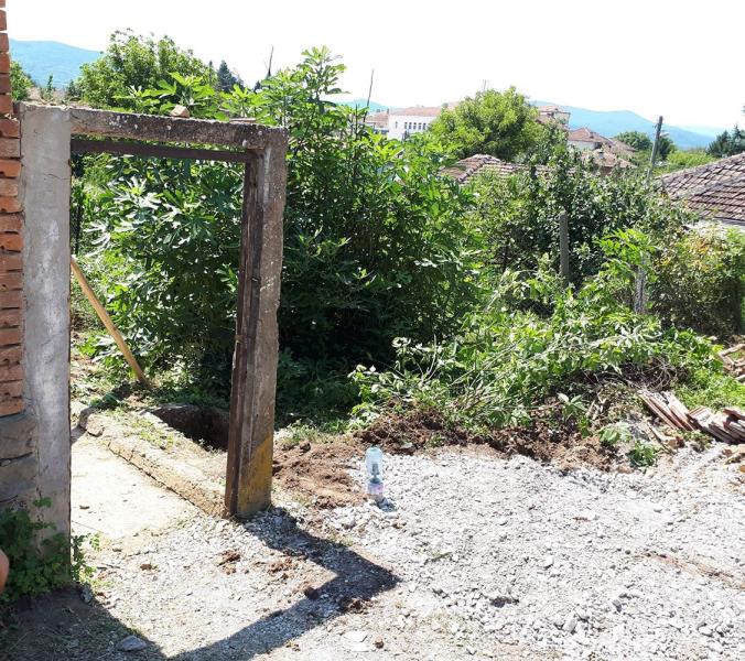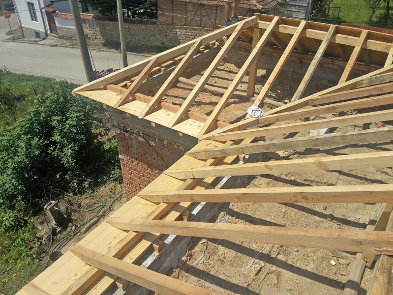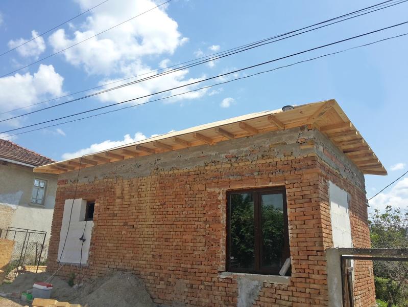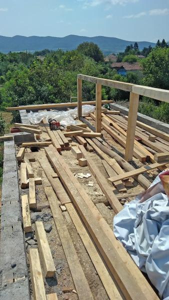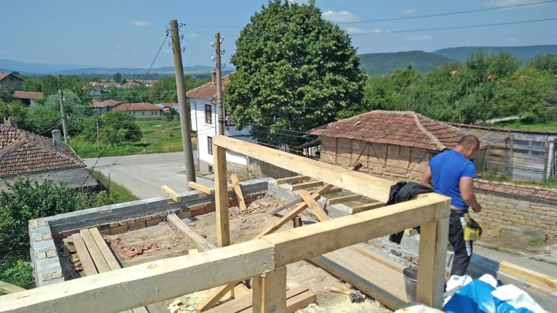 A making of a new roof of a house near the town of Zlataritsa. A wall damaged after an earthquake had to be rebuild and straightened. A corner of the house had to be supported after it had settled and the gaps between the stones were big.