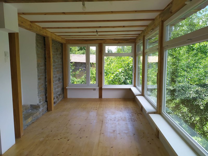 ·       This is a house in a village near the town of Gabrovo. This is an old village house that we have been progressively updating.  This job was to create a bright, cosy room with lots of glass and good views for relaxation. It was built in the place of an old agricultural building used for farm animals. The scope was to remove the old farm building and make foundations and new room in its place. We also installed a 1M3 water tank under the floor to back up the house water supply in the dry periods.